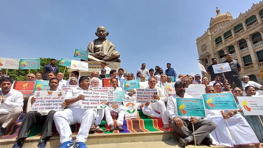 ಕೇಂದ್ರ ಸರ್ಕಾರದಿಂದ ರಾಜ್ಯ ಸರ್ಕಾರಕ್ಕೆ ಬರಬೇಕಾಗಿರುವ ಬರ ಪರಿಹಾರದಲ್ಲಿ ತಾರತಮ್ಯ ವನ್ನು ವಿರೋಧಿಸಿ ವಿಧಾನಸೌಧದ ಗಾಂಧಿ ಪ್ರತಿಮೆಯ ಮುಂಭಾಗದಲ್ಲಿ ಮಂಗಳವಾರ ನಡೆದ ಧರಣಿಯಲ್ಲಿ ಭಾಗವಹಿಸಿ ಅವರು ಮಾತನಾಡಿದರು.
