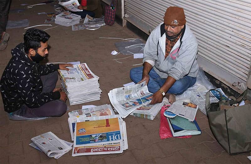 ‘ಪ್ರಜಾವಾಣಿ’, ‘ಡೆಕ್ಕನ್ ಹೆರಾಲ್ಡ್’ನ ಮುದ್ರಣಾಲಯದಲ್ಲಿ, ಪ್ಯಾಕ್ ಆಗಿ ಹೊರಬಂದ ಬಂಡಲ್ಗಳ ಮೇಲೆ ರೋಗನಿವಾರಕಗಳನ್ನು ಸಿಂಪಡಣೆ ಮಾಡಿ ವಿತರಕರ ಕೈಗೆ ನೀಡಲಾಗುತ್ತದೆ.