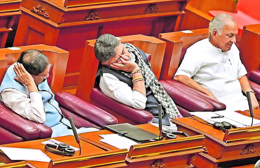 ಬೆಳಗಾವಿಯ ಸುವರ್ಣ ವಿಧಾನಸೌಧದಲ್ಲಿ ಬುಧವಾರ ಚಳಿಗಾಲದ ಅಧಿವೇಶನದ ವಿಧಾನಪರಿಷತ್ ಕಲಾಪದಲ್ಲಿ ಉಪ ಮುಖ್ಯಮಂತ್ರಿ ಡಿ.ಕೆ ಶಿವಕುಮಾರ್ ನಿದ್ರೆಗೆ ಜಾರಿದ್ದರು. ಗೃಹ ಸಚಿವ ಪರಮೇಶ್ವರ ಮತ್ತು ಸಭಾನಾಯಕ ಎನ್.ಎಸ್.ಬೋಸರಾಜು ಅಕ್ಕಪಕ್ಕದಲ್ಲಿದ್ದರು.