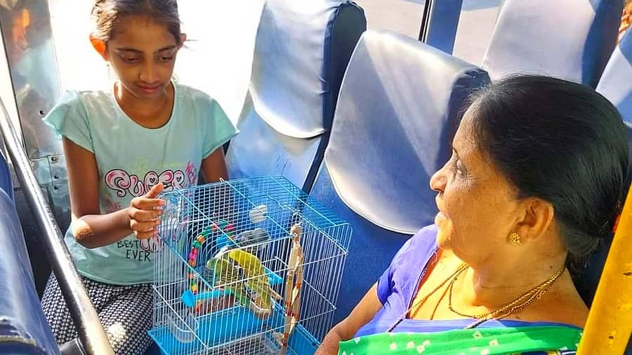 ಅವರು ನೀಡಿದ ಹಾಗೂ ಅಜ್ಜಿ–ಮೊಮ್ಮಗಳು ಗಿಳಿಗಳೊಂದಿಗೆ ಸಂಚರಿಸಿದ ಚಿತ್ರಗಳು ಸಾಮಾಜಿಕ ಜಾಲತಾಣದಲ್ಲಿ ಬುಧವಾರ ಹಬ್ಬಿವೆ. ಇವರು ಬೆಂಗಳೂರಿನಿಂದ ಮೈಸೂರಿಗೆ ಪ್ರಯಾಣಿಸಿದ್ದಾರೆ.