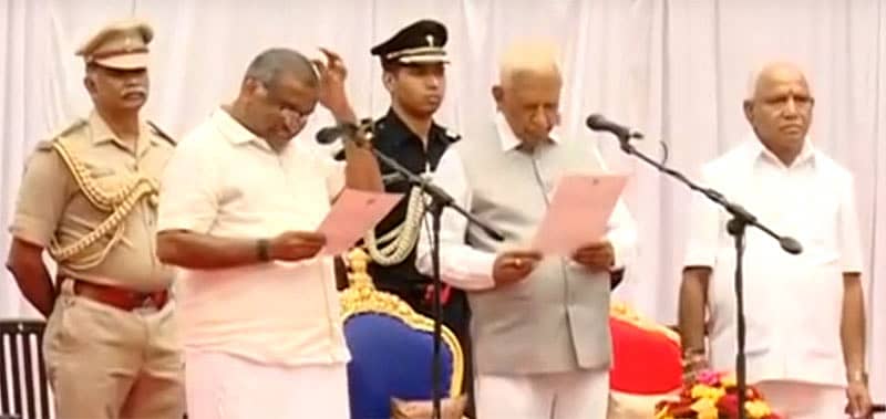 ಬೆಂಗಳೂರು: ರಾಜಭವನದಲ್ಲಿ ಇಂದು ನಡೆದ ಸಚಿವರ ಪ್ರಮಾಣ ವಚನ ಸ್ವೀಕಾರ ಸಮಾರಂಭದಲ್ಲಿ ಹಾಸ್ಯ ಪ್ರಸಂಗವೊಂದು ನಡೆಯಿತು. ಚಿಕ್ಕನಾಯಕನಹಳ್ಳಿ ಶಾಸಕ ಜೆ.ಸಿ ಮಾಧುಸ್ವಾಮಿ ಅವರು ಪ್ರತಿಜ್ಞಾ ವಿಧಿ ಸ್ವೀಕರಿಸುವಾಗ ಎಡವಟ್ಟು ಮಾಡಿಕೊಂಡರು.