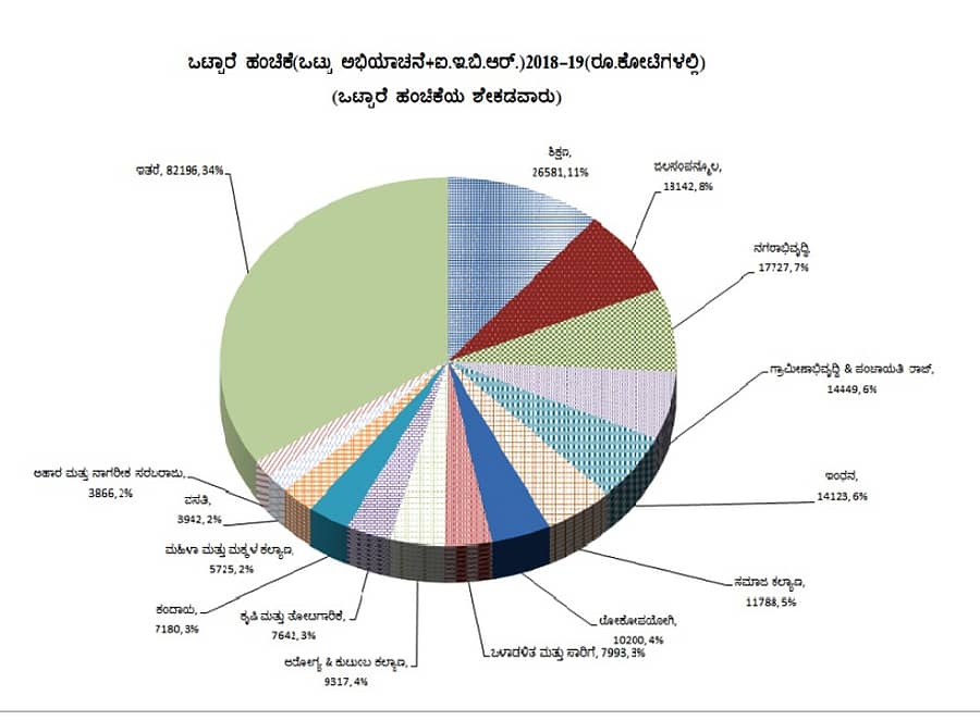 2018–19ನೇ ಸಾಲಿನಲ್ಲಿ ಒಟ್ಟು ಜಮೆ ₹2,13,734 ಕೋಟಿಗಳಾಗುತ್ತದೆ ಎಂದು ಅಂದಾಜು ಮಾಡಲಾಗಿದೆ. ಇದರಲ್ಲಿ 1,66,396 ಕೋಟಿ ರಾಜಸ್ವ ಜಮೆಗಳು ಹಾಗೂ ₹ 47,134 ಕೋಟಿಸಾಲ ಸೇರಿದಂತೆ ₹ 47,338 ಕೋಟಿಗಳ ಬಂಡವಾಳ ಜಮೆ ಒಳಗೊಂಡಿದೆ. ₹ 1,66,290 ಕೋಟಿಗಳ ರಾಜಸ್ವ ವೆಚ್ಚ, ₹41,063 ಕೋಟಿಗಳ ಬಂಡವಾಳ ಹಾಗೂ ಸಾಲದ ಮರುಪಾವತಿ ₹11,136 ಕೋಟಿಗಳ ವೆಚ್ಚವನ್ನು ಒಳಗೊಂಡು ಒಟ್ಟು ವೆಚ್ಚವು ₹ 2,18,488 ಕೋಟಿಗಳ ಅಂದಾಜು ಮಾಡಲಾಗಿದೆ.