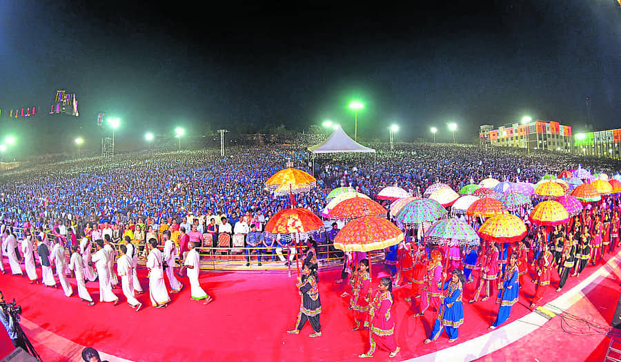 25 ಎಕರೆಗೂ ವಿಸ್ತಾರದ ಪ್ರದೇಶದಲ್ಲಿ ಆಯೋಜಿಸಿದ್ದ ವಿವಿಧ ಪ್ರದರ್ಶನಗಳು, ಐದು ವೇದಿಕೆಗಳಲ್ಲಿ ಬೆಳಿಗ್ಗೆ 10 ಗಂಟೆಗೆ ಆರಂಭವಾದ ಸಾಂಸ್ಕೃತಿಕ ಕಾರ್ಯಕ್ರಮಗಳನ್ನು ದಿನವಿಡೀ ಕಾಲ್ನಡಿಗೆಯಲ್ಲೇ ಓಡಾಡಿ ವೀಕ್ಷಿಸಿ ಸುಸ್ತಾಗಿದ್ದ ವಿದ್ಯಾರ್ಥಿಗಳು, ಸಂಜೆ ಸೂರ್ಯ ಮುಳುಗುವ ಹೊತ್ತಿಗೆ ಶ್ರೀಮತಿ ವನಜಾಕ್ಷಿ ಕೆ. ಶ್ರೀಪತಿ ಭಟ್ ವೇದಿಕೆಯ ಮುಂದೆ ಶಿಸ್ತುಬದ್ಧವಾಗಿ ಕುಳಿತು ಉದ್ಘಾಟನಾ ಕಾರ್ಯಕ್ರಮಕ್ಕೆ ಸಾಕ್ಷಿಯಾದರು.
