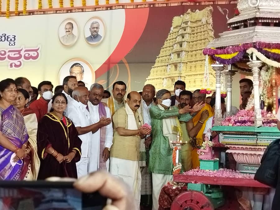ಕೋವಿಡ್ ಮೂರನೇ ಅಲೆಯ ಆತಂಕದ ನಡುವೆಯೂ ನವರಾತ್ರಿಯ ಸರಳ, ಸಾಂಪ್ರದಾಯಿಕ ಆಚರಣೆಯ ಆರಂಭದ ಕ್ಷಣಗಳಿಗೆ ಬೆಟ್ಟದಲ್ಲಿ ನೆರೆದಿದ್ದ ನೂರಾರು ಗಣ್ಯರು, ಗ್ರಾಮಸ್ಥರು ಸಾಕ್ಷಿಯಾದರು.