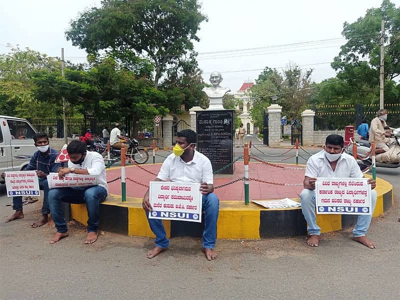 ಮೈಸೂರು: ಹೊರರಾಜ್ಯ ಮತ್ತು ವಿದೇಶಗಳಲ್ಲಿ ಸಿಲುಕಿಕೊಂಡಿರುವ ವಿದ್ಯಾರ್ಥಿಗಳನ್ನು ಉಚಿತವಾಗಿ ರಾಜ್ಯಕ್ಕೆ ಕರೆತರಬೇಕು ಎಂದು ಒತ್ತಾಯಿಸಿ ನ್ಯಾಷನಲ್ ಸ್ಟೂಡೆಂಟ್ಸ್ ಯೂನಿಯನ್ ಆಫ್ ಇಂಡಿಯಾ (ಎನ್ಎಸ್ಯುಐ)ಕಾರ್ಯಕರ್ತರು ಜಿಲ್ಲಾ ನ್ಯಾಯಾಲಯದ ಮಹಾತ್ಮ ಗಾಂಧಿ ಪುತ್ಥಳಿ ಎದುರು ಶುಕ್ರವಾರ ಮೌನ ಪ್ರತಿಭಟನೆ ನಡೆಸಿದರು.
