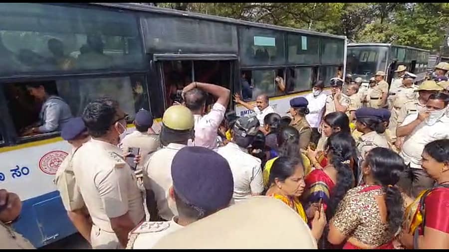 ಹೆಚ್ಚಿನ ಸಂಖ್ಯೆಯಲ್ಲಿ ಸೇರಿದ ಪೊಲೀಸರು, ರಸ್ತೆ ಸಂಚಾರ ತಡೆ ನೆಪ ಹೇಳಿ ಕಾರ್ಯಕರ್ತೆಯರು ಹಾಗೂ ಸಹಾಯಕಿಯರನ್ನು ವಶಕ್ಕೆ ಪಡೆದರು. ಬಿಎಂಟಿಸಿ ಬಸ್ಗಳಲ್ಲಿ ನಗರದ ಹಲವು ಮೈದಾನಗಳಿಗೆ ಕರೆದೊಯ್ದು ರಾತ್ರಿಯವರೆಗೂ ಇರಿಸಿಕೊಂಡರು.