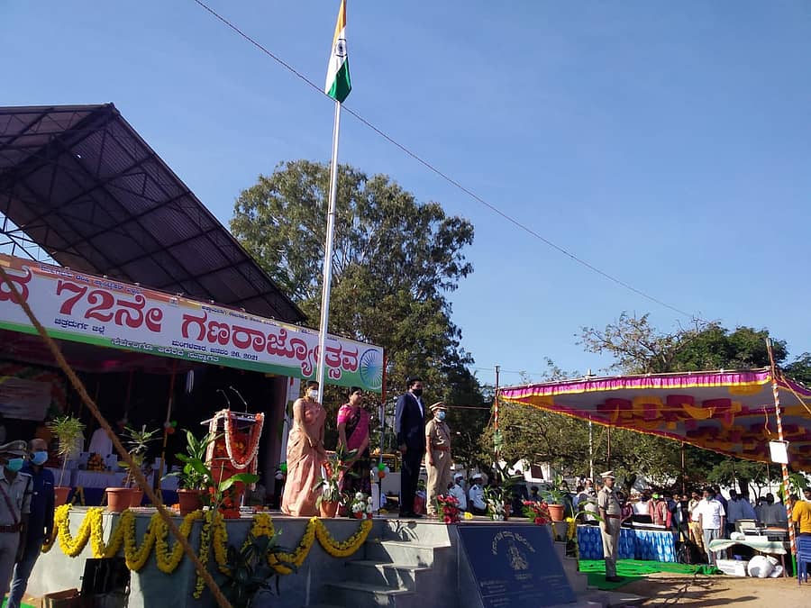 ರಾಯಚೂರು: ನಗರದ ಜಿಲ್ಲಾ ಪೊಲೀಸ್ ಮೈದಾನದಲ್ಲಿ ಏರ್ಪಡಿಸಿದ್ದ ಗಣರಾಜ್ಯೋತ್ಸವ ಸಮಾರಂಭದಲ್ಲಿ ಉಪಮುಖ್ಯಮಂತ್ರಿ ರಾಷ್ಟ್ರ ಧ್ವಜಾರೋಹಣ ನೆರವೇರಿಸಿದರು.