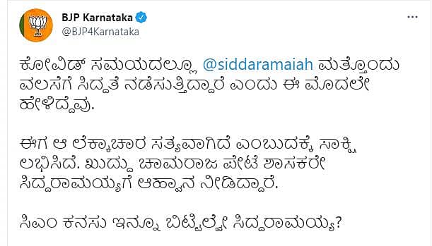 ಇದೇವೇಳೆ, ದಿನಪತ್ರಿಕೆಯೊಂದರ ವರದಿಯ ಚಿತ್ರ ಟ್ವೀಟ್ ಮಾಡಿರುವ ಬಿಜೆಪಿ, ಕೋವಿಡ್ ಸಮಯದಲ್ಲೂ ಸಿದ್ದರಾಮಯ್ಯ ಮತ್ತೊಂದು ವಲಸೆಗೆ ಸಿದ್ದತೆ ನಡೆಸುತ್ತಿದ್ದಾರೆ ಎಂದು ಈ ಮೊದಲೇ ಹೇಳಿದ್ದೆವು. ಈಗ ಆ ಲೆಕ್ಕಾಚಾರ ಸತ್ಯವಾಗಿದೆ ಎಂಬುದಕ್ಕೆ ಸಾಕ್ಷಿ ಲಭಿಸಿದೆ. ಖುದ್ದು ಚಾಮರಾಜ ಪೇಟೆ ಶಾಸಕರೇ(ಜಮೀರ್ ಅಹಮ್ಮದ್) ಸಿದ್ದರಾಮಯ್ಯಗೆ ಆಹ್ವಾನ ನೀಡಿದ್ದಾರೆ. ಸಿಎಂ ಕನಸು ಇನ್ನೂ ಬಿಟ್ಟಿಲ್ವೇ ಸಿದ್ದರಾಮಯ್ಯ? ಎಂದು ಬಿಜೆಪಿ ವ್ಯವ್ಯ ಮಾಡಿದೆ.