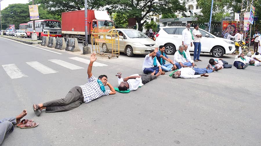 ನಗರದ ಜೆ.ಸಿ ವೃತ್ತದಲ್ಲಿ ಕನ್ನಡಸೇನೆ ಸದಸ್ಯರು ಬೆಂಗಳೂರು- ಮೈಸೂರು ರಾಷ್ಟ್ರೀಯ ಹೆದ್ದಾರಿಯಲ್ಲಿ ಮಲಗಿ ಪ್ರತಿಭಟನೆ ನಡೆಸಿದರು. ಸುಪ್ರೀಂಕೋರ್ಟ್ ಕರ್ನಾಟಕ ರಾಜ್ಯದ ವಿರುದ್ಧ ಮತ್ತೆ ಮತ್ತೆ ಮರಣಶಾಸನ ಬರೆಯುತ್ತಿದೆ ಎಂದು ಆಕ್ರೋಶ ವ್ಯಕ್ತಪಡಿಸಿದರು.
