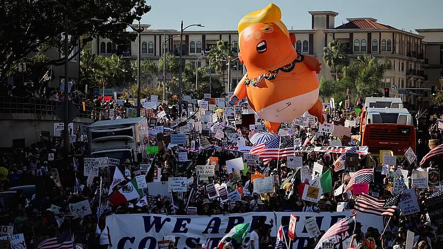 ಕಿಕ್ಕಿರಿದು ಸೇರಿದ್ದ ಜನರು ಟ್ರಂಪ್ ಪ್ರತಿಕೃತಿ ಹಿಡಿದು ಘೋಷಣೆಗಳನ್ನು ಕೂಗಿದರು. ಅಮೆರಿಕದ ಸಾವಿರಾರು ಸ್ಥಳಗಳಲ್ಲಿ ಶನಿವಾರ ಕಂಡುಬಂದ ದೃಶ್ಯವಿದು. ರಾಜನಂತೆ ವರ್ತಿಸುವ ಅಧ್ಯಕ್ಷ ನಮಗೆ ಬೇಡ ಎಂದು ಆಕ್ರೋಶ ವ್ಯಕ್ತಪಡಿಸಿದರು. ಅಮೆರಿಕದಾದ್ಯಂತ ಶನಿವಾರ ಅಧ್ಯಕ್ಷ ಡೊನಾಲ್ಡ್ ಟ್ರಂಪ್ ಅವರ ಆಡಳಿತ ವೈಖರಿ ಖಂಡಿಸಿ ನೋ ಕಿಂಗ್ಸ್ ಪ್ರತಿಭಟನೆ ನಡೆಯಿತು.
