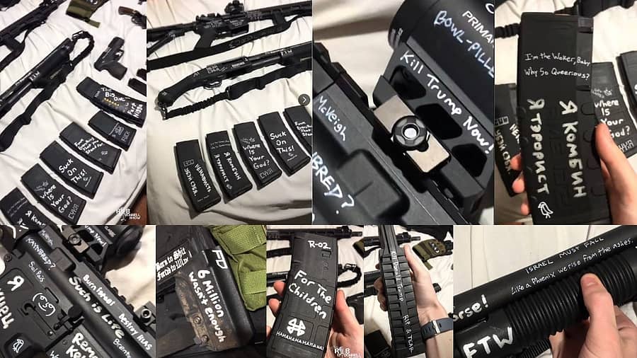 ಕೃತ್ಯಕ್ಕೆ ಈತ ಬಳಸಿದ ಬಂದೂಕುಗಳು ಎಂದೆನ್ನಲಾದ ವಿಡಿಯೊ ಎಲ್ಲೆಡೆ ಹರಿದಾಡುತ್ತಿದೆ. ಇದರಲ್ಲಿ ರೈಫಲ್ ಮತ್ತು ಬಂದೂಕನ್ನು ಬಳಸಲಾಗಿದೆ. ಅದರಲ್ಲಿ ಒಂದರ ಮೇಲೆ ‘ನ್ಯೂಕ್ ಇಂಡಿಯಾ’ ಎಂದು ಬರೆಯಲಾಗಿದೆ. ಮತ್ತೊಂದರಲ್ಲಿ ‘ಮಶಾಲ್ಲಾ (Mashallah)’ ಎಂದು ಬಿಳಿ ಬಣ್ಣದಲ್ಲಿ ಬರೆಯಲಾಗಿದೆ.