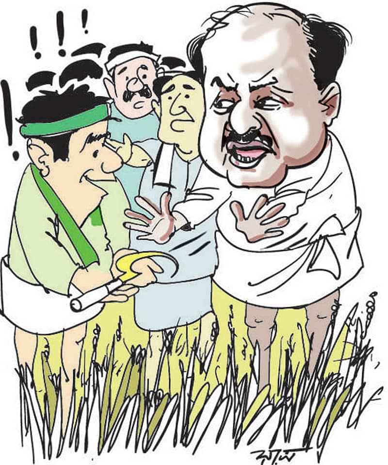 ಮುಖ್ಯಮಂತ್ರಿ ಕುಡುಗೋಲು ಹಿಡಿಯಲು ನಿರಾಕರಿಸಿದರು. ಆದರೆ ಸಚಿವರು, ವಿಧಾನಪರಿಷತ್ ಸದಸ್ಯರು, ಶಾಸಕರು ಭತ್ತ ಕೊಯ್ಲಿಗೆ ನಿಂತರು. ರೈತರು ಸಾಲಾಗಿ ಭತ್ತ ಕೊಯ್ಲು ಮಾಡಿ ಕಂತೆ ಕಟ್ಟಲು ಒಂದು ಕಡೆ ಸಾಲಾಗಿ ಇಟ್ಟರು. ಆದರೆ ಈ ಜನಪ್ರತಿನಿಧಿಗಳು ಕೊಯ್ಲು ಮಾಡಿದ ಭತ್ತವನ್ನು ಕಾಲ ಕೆಳಗೆ ಹಾಕಿ ತುಳಿದಾಡಿದರು. ಅವರಿಗೆ ಕೊಯ್ಲು ಅಂದರೆ ಕುಯ್ಯುವಷ್ಟೇ ಗೊತ್ತು, ಕೊಯ್ದ ಭತ್ತವನ್ನು ಸಂರಕ್ಷಿಸುವ ಕೃಷಿ ಗೊತ್ತಿಲ್ಲ. ಇದನ್ನು ಕಂಡ ರೈತ ಮಹಿಳೆಯೊಬ್ಬರು ‘ಮಣ್ಣಿನ ಮಕ್ಕಳು ಭತ್ತದ ಕಾಳನ್ನು ಮಣ್ಣು ಪಾಲು ಮಾಡಿದರು’ ಎಂದು ಮೂದಲಿಸಿದರು. ಇನ್ನೊಂದೆಡೆ ಗದ್ದೆಯ ಮಾಲೀಕ ‘ಅಯ್ಯೋ, ನನ್ನ ಗದ್ದೆ ಹಾಳಾಯ್ತು’ ಎಂದು ಗೋಳಿಟ್ಟದ್ದು ಯಾರಿಗೂ ಕೇಳಿಸಲಿಲ್ಲ!
