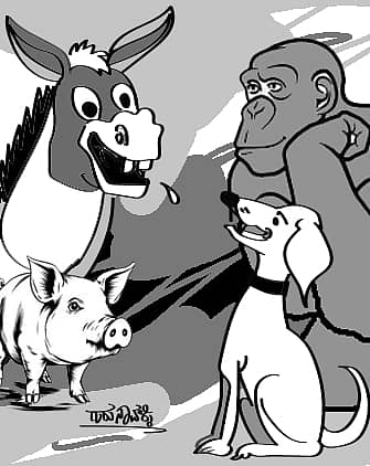 ಕತ್ತೆ ಎದ್ದು ನಿಂತು ಏಕಾಏಕಿ ಕೋತಿ, ನಾಯಿಯನ್ನು ತರಾಟೆಗೆ ತೆಗೆದುಕೊಂಡಿತು.