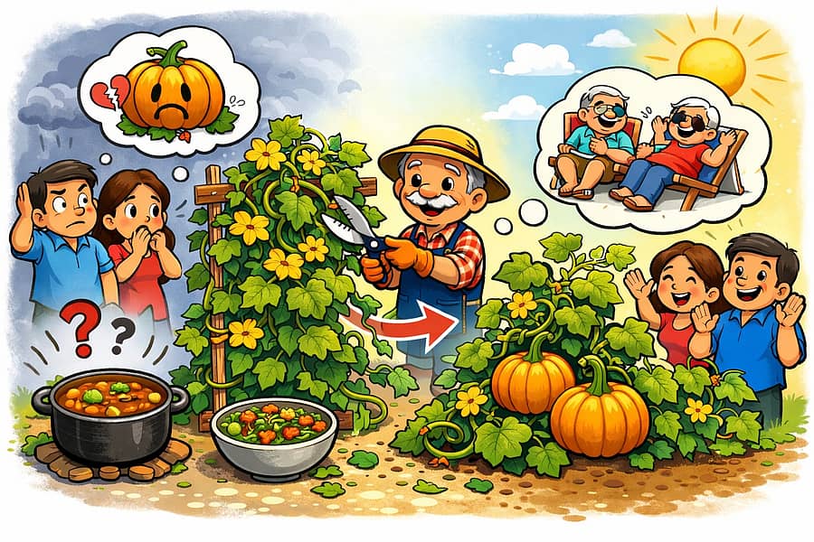 ಅಷ್ಟು ಚೆಂದ ಬೆಳೆದ ಬಳ್ಳಿಯನ್ನು ಕತ್ತರಿಸುವುದೇ? ಹಾಗೆ ಕತ್ತರಿಸಿದರೆ ಗಿಡದ ಬೆಳವಣಿಗೆಗೆ ‘ಕ್ಕೆಯಾಗುವುದಿಲ್ಲವೇ? ಗಿಡ ಸೊರಗಿದರೆ ಕಾಯಿ ಬಿಡುವುದಾದರೂ ಹೇಗೆ? ಇಂಥವೆಲ್ಲ ಸಂದೇಹ ಸಹಜ. ಆದರೆ ನಿಜವಾಗಿ ಬಳ್ಳಿ ಹೀಗೆ ಸೊಂಪಾಗಿ ಬೆಳೆದದ್ದೇ ಫಸಲಿಗೆ ಮಾರಕ. ಒಂದೆರಡು ಸಲ ಹೀಗೆ ಚಿಗುರು ಚಿವುಟಿದ ಬಳಿಕ ಒಳ್ಳೆಯ ಬೆಳೆ ಬರುತ್ತದೆ.