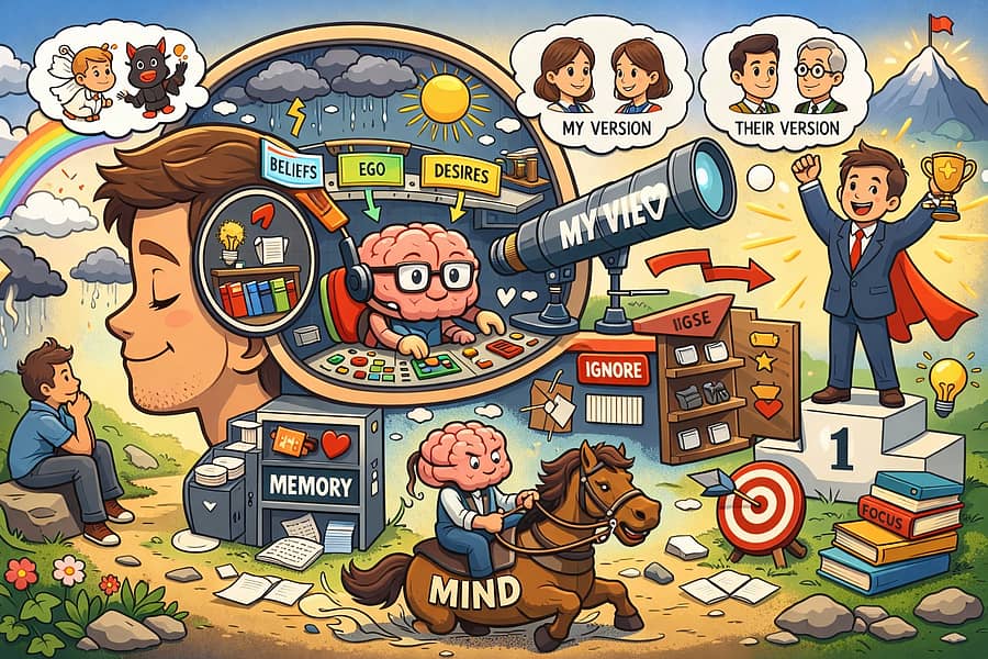 ಹೀಗೆ ಹೇಳಿದರೆ ಅರ್ಥವಾಗಬಹುದು ನಾನು ನಿಮ್ಮನ್ನು ನೋಡಿ ‘ನೀವು ಹೀಗಿದ್ದೀರಿ‘ ಎಂದು ಹೇಳುತ್ತೇನೆ ಅಥವಾ ಅಂದುಕೊಳ್ಳುತ್ತೇನೆ ಎಂದು ಇಟ್ಟುಕೊಳ್ಳಿ. ಅಂದ ಮಾತ್ರಕ್ಕೆ ನೀವು ಹಾಗೇ ಇದ್ದೀರೆಂದಲ್ಲ. ನಾನು ಭಾವಿಸಿದ ನೀವು ನಾ ಕಂಡ ನೀವಾಗಿರುತ್ತೀರೇ ಹೊರತು ನಿಜವಾದ ನಿಮ್ಮನ್ನಲ್ಲ. ಬೇರೆಯವರು ನಿಮ್ಮ ಬಗ್ಗೆ ಬೇರೆಯದನ್ನೇ ಹೇಳಬಹುದು. ನಾನು ಕಂಡ ‘ನೀವು’ ಬೇರೆ ಮತ್ತು ಇನ್ನೊಬ್ಬರು ಕಂಡ ‘ನೀವು’ ಸಂಪೂರ್ಣ ಭಿನ್ನವಾಗಿರಬಹುದು. ನಮ್ಮ ಗ್ರಹಣಶಕ್ತಿಯ ಮೇಲೆ ನಮ್ಮ ಮನಸ್ಸು ಪ್ರಭಾವ ಬೀರಿ, ಏನೇನೋ ಬಣ್ಣದ ಮೆರುಗನ್ನು ಕೊಟ್ಟು ತನ್ನದೇ ಆದ ರೀತಿಯಲ್ಲಿ ನೋಡುವಂತೆ ಮಾಡುತ್ತದೆ. ನಮ್ಮ ಮನಸ್ಸು ಎಷ್ಟು ಪ್ರಭಾವವುಳ್ಳದ್ದಾಗಿದೆಯೆಂದರೆ ತನಗೆ ಬೇಕಾದ್ದನ್ನು ಮಾತ್ರ ನೋಡುವಂತೆ, ಹೇಳುವಂತೆ ಮಾಡಿ ಇತರ ಎಲ್ಲದನ್ನು ಕೇಳದಂತೆ, ನೋಡದಂತೆ ತಡೆಯುತ್ತದೆ. ಅದರೊಳಗೆ ತನಗೆ ಬೇಕಾದ ವ್ಯಕ್ತಿಗಳ ಮುಖ ಮಾತ್ರ ಸಂಗ್ರಹವಾಗಿರುತ್ತದೆ. ತನಗೆ ಆಪ್ತವಾಗುವ ಸಂಗತಿ ಮಾತ್ರ ಅಚ್ಚೊತ್ತಿರುತ್ತದೆ.
