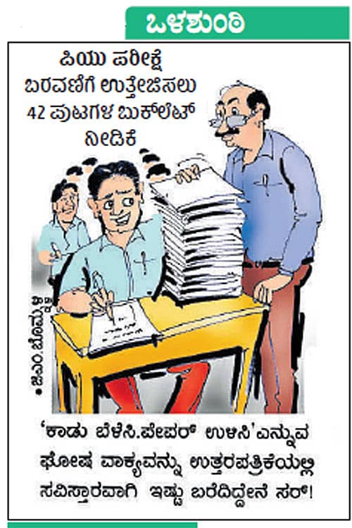 ದ್ವಿತೀಯ ಪಿಯುಸಿ ಪಬ್ಲಿಕ್ ಪರೀಕ್ಷೆಯಲ್ಲಿ ಉತ್ತರಿಸಲು ವಿದ್ಯಾರ್ಥಿಗಳಿಗೆ 42 ಪುಟಗಳ ಬುಕ್ಲೆಟ್ ಕೊಡುವ ಪಿಯು ಮಂಡಳಿಯ ನಿರ್ಧಾರ ದುರದೃಷ್ಟಕರ ಮತ್ತು ವಿವೇಚನಾರಹಿತವಾದುದು. ಎಲ್ಲೋ ಶೇ 10ಕ್ಕಿಂತಲೂ ಕಡಿಮೆ ವಿದ್ಯಾರ್ಥಿಗಳಿಗೆ ಗಣಿತದಂತಹ ಒಂದೆರಡು ವಿಷಯಗಳಿಗೆ 20ಕ್ಕಿಂತ ಹೆಚ್ಚು ಪುಟಗಳು ಬೇಕಾಗಬಹುದು. ಅದಕ್ಕಾಗಿ ಎಲ್ಲ ವಿದ್ಯಾರ್ಥಿಗಳಿಗೆ ಎಲ್ಲ ವಿಷಯಗಳಿಗೂ ಹೆಚ್ಚಿನ ಪೇಪರ್ ಕೊಡುವುದು ಅನುಚಿತ ಮಾತ್ರವಲ್ಲ ಕಾಗದದ ವ್ಯರ್ಥ ಬಳಕೆಯೇ ಸರಿ.
