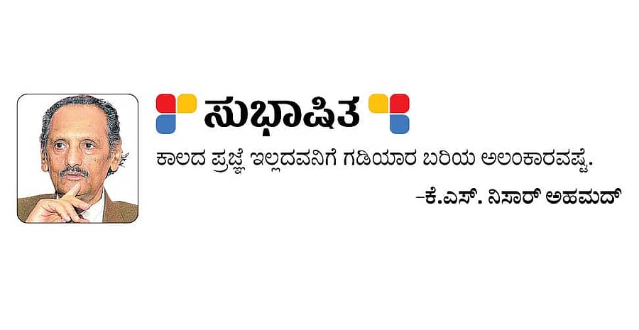 <p>ಸುಭಾಷಿತ: ಕೆ.ಎಸ್.ನಿಸಾರ್ ಅಹಮದ್</p>.<div><p><strong>ಪ್ರಜಾವಾಣಿ ಆ್ಯಪ್ ಇಲ್ಲಿದೆ: <a href="https://play.google.com/store/apps/details?id=com.tpml.pv">ಆಂಡ್ರಾಯ್ಡ್ </a>| <a href="https://apps.apple.com/in/app/prajavani-kannada-news-app/id1535764933">ಐಒಎಸ್</a> | <a href="https://whatsapp.com/channel/0029Va94OfB1dAw2Z4q5mK40">ವಾಟ್ಸ್ಆ್ಯಪ್</a>, <a href="https://www.twitter.com/prajavani">ಎಕ್ಸ್</a>, <a href="https://www.fb.com/prajavani.net">ಫೇಸ್ಬುಕ್</a> ಮತ್ತು <a href="https://www.instagram.com/prajavani">ಇನ್ಸ್ಟಾಗ್ರಾಂ</a>ನಲ್ಲಿ ಪ್ರಜಾವಾಣಿ ಫಾಲೋ ಮಾಡಿ.</strong></p></div>