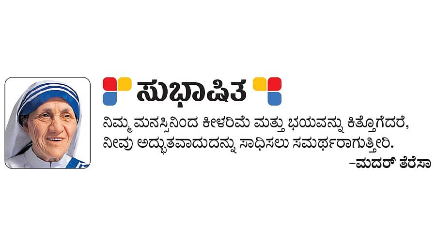 <p>ಸುಭಾಷಿತ: ಮದರ್ ತೆರೆಸಾ</p>.<div><p><strong>ಪ್ರಜಾವಾಣಿ ಆ್ಯಪ್ ಇಲ್ಲಿದೆ: <a href="https://play.google.com/store/apps/details?id=com.tpml.pv">ಆಂಡ್ರಾಯ್ಡ್ </a>| <a href="https://apps.apple.com/in/app/prajavani-kannada-news-app/id1535764933">ಐಒಎಸ್</a> | <a href="https://whatsapp.com/channel/0029Va94OfB1dAw2Z4q5mK40">ವಾಟ್ಸ್ಆ್ಯಪ್</a>, <a href="https://www.twitter.com/prajavani">ಎಕ್ಸ್</a>, <a href="https://www.fb.com/prajavani.net">ಫೇಸ್ಬುಕ್</a> ಮತ್ತು <a href="https://www.instagram.com/prajavani">ಇನ್ಸ್ಟಾಗ್ರಾಂ</a>ನಲ್ಲಿ ಪ್ರಜಾವಾಣಿ ಫಾಲೋ ಮಾಡಿ.</strong></p></div>
