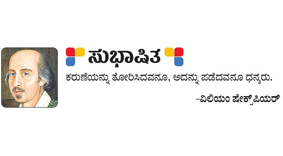 <p>ಸುಭಾಷಿತ: ವಿಲಿಯಂ ಷೇಕ್ಸ್ಪಿಯರ್</p>.<div><p><strong>ಪ್ರಜಾವಾಣಿ ಆ್ಯಪ್ ಇಲ್ಲಿದೆ: <a href="https://play.google.com/store/apps/details?id=com.tpml.pv">ಆಂಡ್ರಾಯ್ಡ್ </a>| <a href="https://apps.apple.com/in/app/prajavani-kannada-news-app/id1535764933">ಐಒಎಸ್</a> | <a href="https://whatsapp.com/channel/0029Va94OfB1dAw2Z4q5mK40">ವಾಟ್ಸ್ಆ್ಯಪ್</a>, <a href="https://www.twitter.com/prajavani">ಎಕ್ಸ್</a>, <a href="https://www.fb.com/prajavani.net">ಫೇಸ್ಬುಕ್</a> ಮತ್ತು <a href="https://www.instagram.com/prajavani">ಇನ್ಸ್ಟಾಗ್ರಾಂ</a>ನಲ್ಲಿ ಪ್ರಜಾವಾಣಿ ಫಾಲೋ ಮಾಡಿ.</strong></p></div>