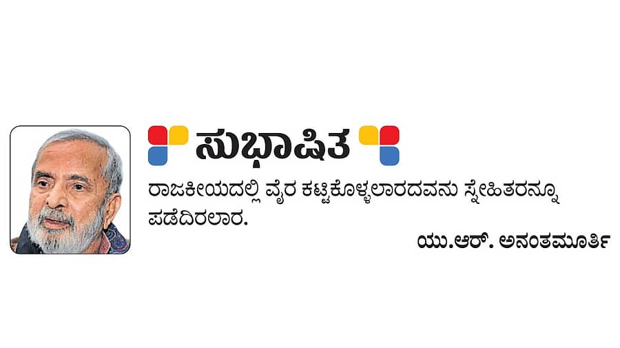 <p>ಸುಭಾಷಿತ: ಯು.ಆರ್.ಅನಂತಮೂರ್ತಿ</p>.<div><p><strong>ಪ್ರಜಾವಾಣಿ ಆ್ಯಪ್ ಇಲ್ಲಿದೆ: <a href="https://play.google.com/store/apps/details?id=com.tpml.pv">ಆಂಡ್ರಾಯ್ಡ್ </a>| <a href="https://apps.apple.com/in/app/prajavani-kannada-news-app/id1535764933">ಐಒಎಸ್</a> | <a href="https://whatsapp.com/channel/0029Va94OfB1dAw2Z4q5mK40">ವಾಟ್ಸ್ಆ್ಯಪ್</a>, <a href="https://www.twitter.com/prajavani">ಎಕ್ಸ್</a>, <a href="https://www.fb.com/prajavani.net">ಫೇಸ್ಬುಕ್</a> ಮತ್ತು <a href="https://www.instagram.com/prajavani">ಇನ್ಸ್ಟಾಗ್ರಾಂ</a>ನಲ್ಲಿ ಪ್ರಜಾವಾಣಿ ಫಾಲೋ ಮಾಡಿ.</strong></p></div>
