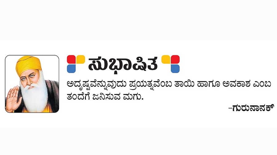 <p>ಸುಭಾಷಿತ: ಗುರುನಾನಕ್</p>.<div><p><strong>ಪ್ರಜಾವಾಣಿ ಆ್ಯಪ್ ಇಲ್ಲಿದೆ: <a href="https://play.google.com/store/apps/details?id=com.tpml.pv">ಆಂಡ್ರಾಯ್ಡ್ </a>| <a href="https://apps.apple.com/in/app/prajavani-kannada-news-app/id1535764933">ಐಒಎಸ್</a> | <a href="https://whatsapp.com/channel/0029Va94OfB1dAw2Z4q5mK40">ವಾಟ್ಸ್ಆ್ಯಪ್</a>, <a href="https://www.twitter.com/prajavani">ಎಕ್ಸ್</a>, <a href="https://www.fb.com/prajavani.net">ಫೇಸ್ಬುಕ್</a> ಮತ್ತು <a href="https://www.instagram.com/prajavani">ಇನ್ಸ್ಟಾಗ್ರಾಂ</a>ನಲ್ಲಿ ಪ್ರಜಾವಾಣಿ ಫಾಲೋ ಮಾಡಿ.</strong></p></div>