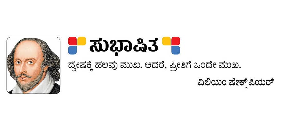 <p>ಸುಭಾಷಿತ: ವಿಲಿಯಂ ಷೇಕ್ಸ್ಪಿಯರ್</p>.<div><p><strong>ಪ್ರಜಾವಾಣಿ ಆ್ಯಪ್ ಇಲ್ಲಿದೆ: <a href="https://play.google.com/store/apps/details?id=com.tpml.pv">ಆಂಡ್ರಾಯ್ಡ್ </a>| <a href="https://apps.apple.com/in/app/prajavani-kannada-news-app/id1535764933">ಐಒಎಸ್</a> | <a href="https://whatsapp.com/channel/0029Va94OfB1dAw2Z4q5mK40">ವಾಟ್ಸ್ಆ್ಯಪ್</a>, <a href="https://www.twitter.com/prajavani">ಎಕ್ಸ್</a>, <a href="https://www.fb.com/prajavani.net">ಫೇಸ್ಬುಕ್</a> ಮತ್ತು <a href="https://www.instagram.com/prajavani">ಇನ್ಸ್ಟಾಗ್ರಾಂ</a>ನಲ್ಲಿ ಪ್ರಜಾವಾಣಿ ಫಾಲೋ ಮಾಡಿ.</strong></p></div>