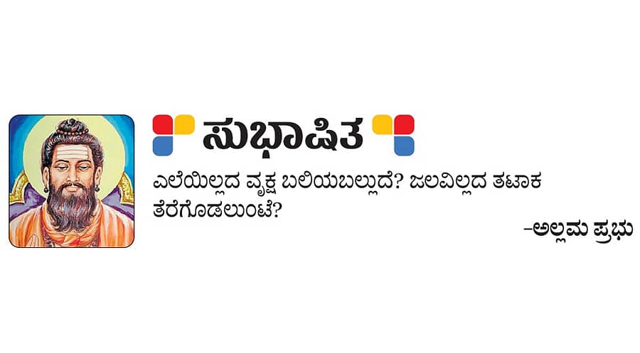 <p>ಸುಭಾಷಿತ: ಅಲ್ಲಮ ಪ್ರಭು</p>.<div><p><strong>ಪ್ರಜಾವಾಣಿ ಆ್ಯಪ್ ಇಲ್ಲಿದೆ: <a href="https://play.google.com/store/apps/details?id=com.tpml.pv">ಆಂಡ್ರಾಯ್ಡ್ </a>| <a href="https://apps.apple.com/in/app/prajavani-kannada-news-app/id1535764933">ಐಒಎಸ್</a> | <a href="https://whatsapp.com/channel/0029Va94OfB1dAw2Z4q5mK40">ವಾಟ್ಸ್ಆ್ಯಪ್</a>, <a href="https://www.twitter.com/prajavani">ಎಕ್ಸ್</a>, <a href="https://www.fb.com/prajavani.net">ಫೇಸ್ಬುಕ್</a> ಮತ್ತು <a href="https://www.instagram.com/prajavani">ಇನ್ಸ್ಟಾಗ್ರಾಂ</a>ನಲ್ಲಿ ಪ್ರಜಾವಾಣಿ ಫಾಲೋ ಮಾಡಿ.</strong></p></div>