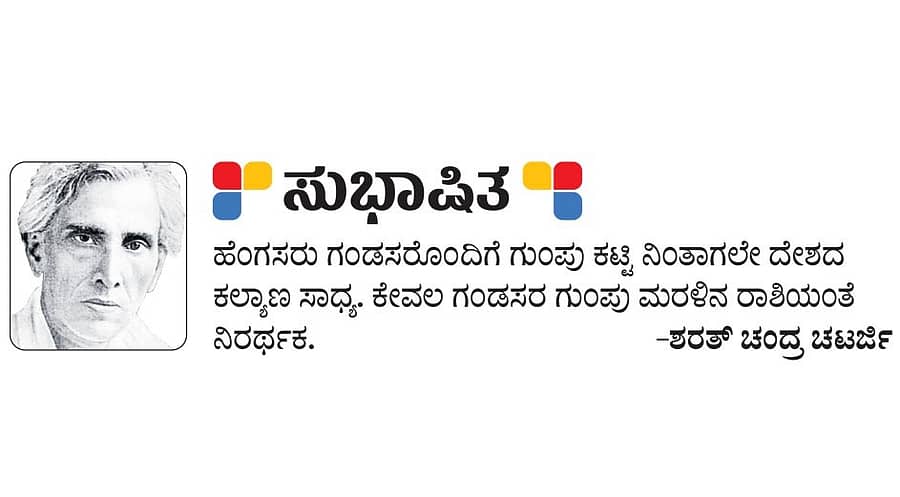 <p>ಸುಭಾಷಿತ: ಶರತ್ ಚಂದ್ರ ಚಟರ್ಜಿ</p>.<div><p><strong>ಪ್ರಜಾವಾಣಿ ಆ್ಯಪ್ ಇಲ್ಲಿದೆ: <a href="https://play.google.com/store/apps/details?id=com.tpml.pv">ಆಂಡ್ರಾಯ್ಡ್ </a>| <a href="https://apps.apple.com/in/app/prajavani-kannada-news-app/id1535764933">ಐಒಎಸ್</a> | <a href="https://whatsapp.com/channel/0029Va94OfB1dAw2Z4q5mK40">ವಾಟ್ಸ್ಆ್ಯಪ್</a>, <a href="https://www.twitter.com/prajavani">ಎಕ್ಸ್</a>, <a href="https://www.fb.com/prajavani.net">ಫೇಸ್ಬುಕ್</a> ಮತ್ತು <a href="https://www.instagram.com/prajavani">ಇನ್ಸ್ಟಾಗ್ರಾಂ</a>ನಲ್ಲಿ ಪ್ರಜಾವಾಣಿ ಫಾಲೋ ಮಾಡಿ.</strong></p></div>