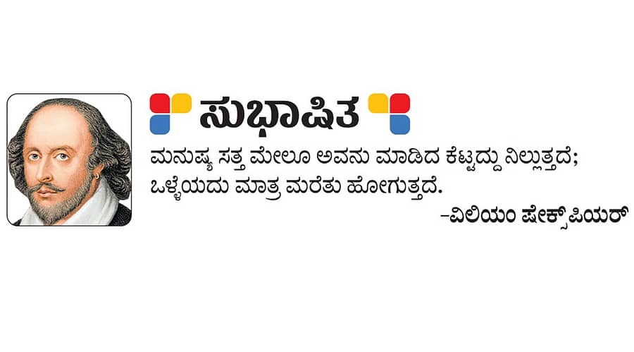 <p>ಸುಭಾಷಿತ: ವಿಲಿಯಂ ಷೇಕ್ಸ್ಪಿಯರ್</p>.<div><p><strong>ಪ್ರಜಾವಾಣಿ ಆ್ಯಪ್ ಇಲ್ಲಿದೆ: <a href="https://play.google.com/store/apps/details?id=com.tpml.pv">ಆಂಡ್ರಾಯ್ಡ್ </a>| <a href="https://apps.apple.com/in/app/prajavani-kannada-news-app/id1535764933">ಐಒಎಸ್</a> | <a href="https://whatsapp.com/channel/0029Va94OfB1dAw2Z4q5mK40">ವಾಟ್ಸ್ಆ್ಯಪ್</a>, <a href="https://www.twitter.com/prajavani">ಎಕ್ಸ್</a>, <a href="https://www.fb.com/prajavani.net">ಫೇಸ್ಬುಕ್</a> ಮತ್ತು <a href="https://www.instagram.com/prajavani">ಇನ್ಸ್ಟಾಗ್ರಾಂ</a>ನಲ್ಲಿ ಪ್ರಜಾವಾಣಿ ಫಾಲೋ ಮಾಡಿ.</strong></p></div>