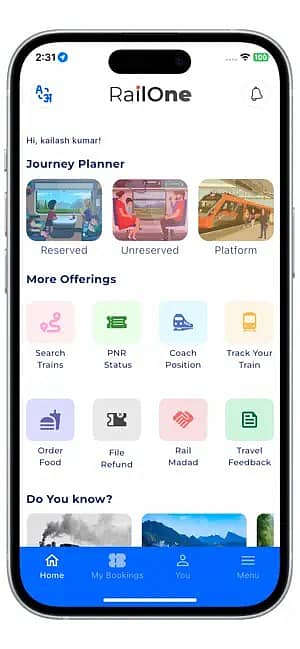 ‘ರೈಲ್ಒನ್’ ಆ್ಯಪ್ನಲ್ಲಿ ಪ್ರಯಾಣಿಕರಿಗೆ ಹಲವು ಆಯ್ಕೆಗಳಿದ್ದು, ರೈಲ್ವೆ ಸೇವೆಗಳನ್ನು ಸುಲಭವಾಗಿ ಪಡೆಯಬಹುದಾಗಿದೆ. ಇದರಲ್ಲಿ ಹಲವು ಸೌಲಭ್ಯಗಳ ಆಯ್ಕೆಗಳಿದ್ದು, ರೈಲ್ವೆ ಪ್ರಯಾಣವನ್ನು ಸುಗಮಗೊಳಿಸುತ್ತದೆ ಎಂದು ರೈಲ್ವೆ ಅಧಿಕಾರಿಗಳು ತಿಳಿಸಿದ್ದಾರೆ.