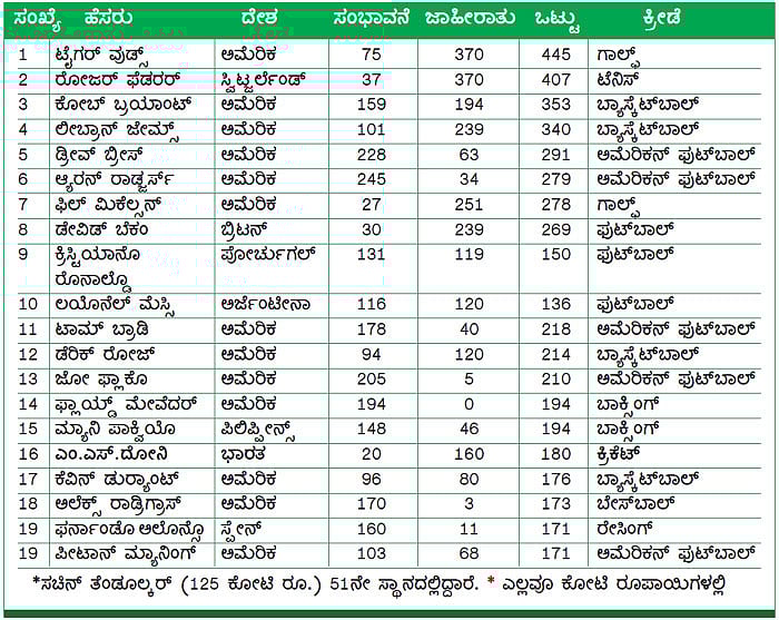 2013ರ ವಿಶ್ವದ 100 ಶ್ರೀಮಂತ ಕ್ರೀಡಾಪಟುಗಳ ಪಟ್ಟಿಯನ್ನು ಶುಕ್ರವಾರ ಫೋಬ್ಸ್ ನಿಯತಕಾಲಿಕ ಪ್ರಕಟಿಸಿದೆ. ಇದರಲ್ಲಿ ಅಮೆರಿಕದ ಗಾಲ್ಫರ್ ಟೈಗರ್ ವುಡ್ಸ್ ಅಗ್ರಸ್ಥಾನದಲ್ಲಿದ್ದಾರೆ. ಅವರು ವಾರ್ಷಿಕ ಒಟ್ಟು 445 ಕೋಟಿ ರೂ. ಸಂಪಾದಿಸುತ್ತಿದ್ದಾರೆ. ಕೇವಲ ಜಾಹೀರಾತಿನಿಂದ ಅವರಿಗೆ 370 ಕೋಟಿ ರೂ. ಬರುತ್ತಿದೆ. ನಂತರದ ಸ್ಥಾನದಲ್ಲಿ ಸ್ವಿಟ್ಜರ್ಲೆಂಡ್ನ ರೋಜರ್ ಫೆಡರರ್ (407 ಕೋಟಿ ರೂ.), ಅಮೆರಿಕದ ಕೋಬ್ ಬ್ರಯಾಂಟ್ (353 ಕೋಟಿ ರೂ.) ಇದ್ದಾರೆ. 2012ರಲ್ಲಿ ಫೋಬ್ಸ್ ಪ್ರಕಟಿಸಿದ್ದ ಪಟ್ಟಿಯಲ್ಲಿ ಫೆಡರರ್ ಅಗ್ರಸ್ಥಾನದಲ್ಲಿದ್ದರು.