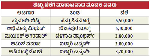 ಹೋದ ವರ್ಷದ ಹರಾಜಿನ ವೇಳೆ ‘ಬಿ’ ಗುಂಪಿನಲ್ಲಿ ಹೆಚ್ಚು ಬೆಲೆಗೆ ಮಾರಾಟವಾಗಿದ್ದ ವಲ್ಚರ್ಸ್ ಕ್ಲಬ್ನ ಅನಿರುದ್ಧ್ ಜೋಶಿಗೆ ಈ ಬಾರಿ ಕಡಿಮೆ ಬೆಲೆ ಲಭಿಸಿತು. 2014ರಲ್ಲಿ ₹ 4.5 ಲಕ್ಷಕ್ಕೆ ಮಂಗಳೂರು ತಂಡದ ಪಾಲಾಗಿದ್ದ ಅನಿರುದ್ಧ್ ಅವರನ್ನು ಬಳ್ಳಾರಿ ತಂಡ ₹ 3.7 ಲಕ್ಷಕ್ಕೆ ಖರೀದಿಸಿತು.