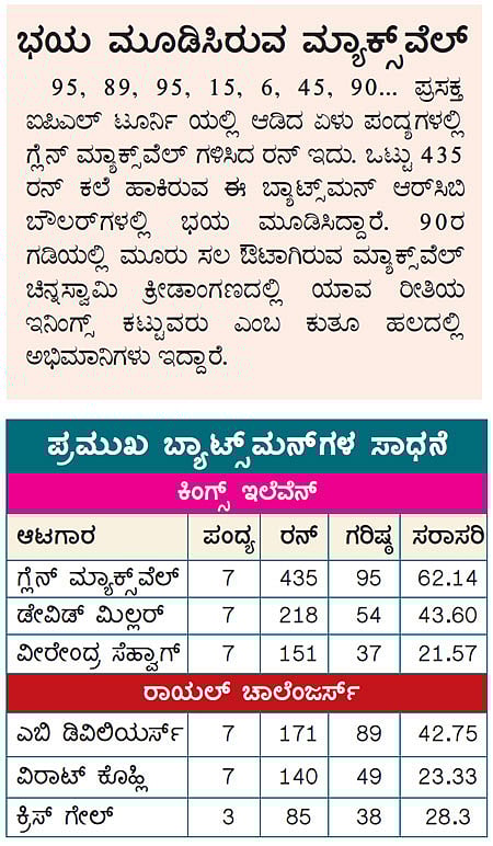 ಗ್ಲೆನ್ ಮ್ಯಾಕ್ಸ್ವೆಲ್ ಮೇಲೆ ಎಲ್ಲರ ಚಿತ್ತ ನೆಟ್ಟಿದೆ. ಆಸ್ಟ್ರೇಲಿಯಾದ ಈ ಬ್ಯಾಟ್ಸ್ಮನ್ ಅಮೋಘ ಫಾರ್ಮ್ನಲ್ಲಿದ್ದಾರೆ. ಮ್ಯಾಕ್ಸ್ವೆಲ್ ಅವರನ್ನು ಕಟ್ಟಿಹಾಕುವ ಯೋಜನೆ ರೂಪಿಸಿಕೊಂಡು ಆರ್ಸಿಬಿ ಕಣಕ್ಕಿಳಿಯಲಿದೆ. ಅದರ ಜೊತೆಗೆ ಮಿಲ್ಲರ್ ಮತ್ತು ಸೆಹ್ವಾಗ್ ಅಬ್ಬರಿಸದಂತೆ ನೋಡಿಕೊಳ್ಳುವ ಸವಾಲು ಕೂಡಾ ಆರ್ಸಿಬಿ ಬೌಲರ್ಗಳ ಮುಂದಿದೆ.