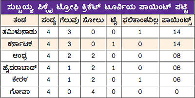 ಕರ್ನಾಟಕ ಮತ್ತು ಹೈದರಾಬಾದ್ ನಡುವಿನ ಪಂದ್ಯ ‘ಟೈ’ ಆಗಿತ್ತು. ಮಳೆ ಸುರಿದ ಕಾರಣ ತಮಿಳುನಾಡು ಹಾಗೂ ಕೇರಳ ನಡುವಿನ ಪಂದ್ಯ ರದ್ದಾಗಿತ್ತು. ಆದ್ದರಿಂದ ಉಭಯ ತಂಡಗಳು ತಲಾ 14 ಪಾಯಿಂಟ್ಗಳನ್ನು ಹೊಂದಿವೆ. ಆದರೆ, ರನ್ ಸರಾಸರಿ ಆಧಾರದ ಮೇಲೆ ತಮಿಳುನಾಡು ಪಾಯಿಂಟ್ ಪಟ್ಟಿಯಲ್ಲಿ ಅಗ್ರಸ್ಥಾನದಲ್ಲಿದೆ. ಇಂದಿನ ಪಂದ್ಯದಲ್ಲಿ ಗೆಲುವು ಸಾಧಿಸುವವರು ದಕ್ಷಿಣ ವಲಯದ ಚಾಂಪಿಯನ್ ಎನಿಸಿಕೊಳ್ಳಲಿದ್ದಾರೆ.