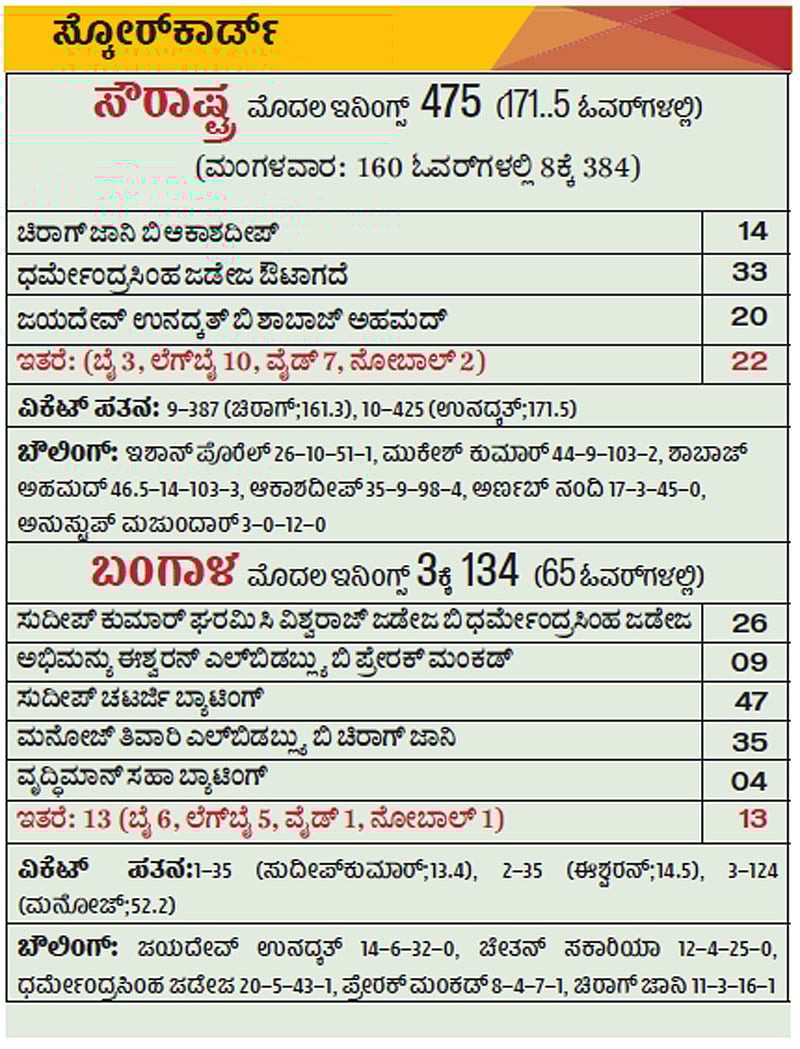 ದಿನದಿಂದ ದಿನಕ್ಕೆ ಸತ್ವ ಕಳೆದುಕೊಳ್ಳುತ್ತಿರುವ ಪಿಚ್ನಲ್ಲಿ ರನ್ ಗಳಿಕೆ ದುಸ್ತರವಾಗುತ್ತಿದೆ. ಸೌರಾಷ್ಟ್ರವು ಮೊದಲ ಇನಿಂಗ್ಸ್ನಲ್ಲಿ 425 ರನ್ ಗಳಿಸಿದೆ. ಬಂಗಾಳ ತಂಡವು ಮುನ್ನಡೆಗಾಗಿ ಈಗ ದೊಡ್ಡ ಹೋರಾಟ ನಡೆಸಬೇಕಾದ ಪರಿಸ್ಥಿತಿಯಲ್ಲಿದೆ.