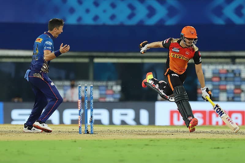 ಅಂತಿಮ 10 ಓವರ್ಗಳಲ್ಲಿ ಹೈದರಾಬಾದ್ ಗೆಲುವಿಗೆ 77 ರನ್ಗಳ ಅವಶ್ಯಕತೆಯಿತ್ತು. ಆದರೆ ನಿರ್ಣಾಯಕ ಹಂತದಲ್ಲಿ ನಾಯಕ ಡೇವಿಡ್ ವಾರ್ನರ್ ರನೌಟ್ ಆಗುವ ಮೂಲಕ ಪಂದ್ಯಕ್ಕೆ ಮಹತ್ವದ ತಿರುವು ಲಭಿಸಿತು. ಹಾರ್ದಿಕ್ ಪಾಂಡ್ಯ ನೇರ ಥ್ರೋ ಮಾಡುವ ಮೂಲಕ ವಾರ್ನರ್ ಅವರನ್ನು ಪೆವಿಲಿಯನ್ಗೆ ಹಿಂತಿರುಗಿಸಿದರು. 34 ಎಸೆತಗಳನ್ನು ಎದುರಿಸಿದ ವಾರ್ನರ್ ತಲಾ ಎರಡು ಬೌಂಡರಿ ಹಾಗೂ ಸಿಕ್ಸರ್ಗಳ ನೆರವಿನಿಂದ 36 ರನ್ ಗಳಿಸಿದರು.