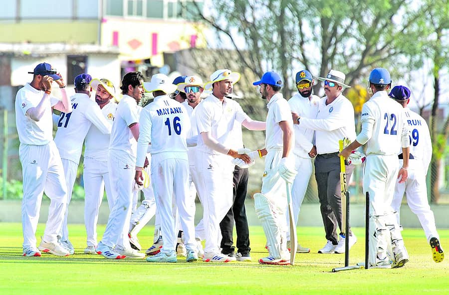 ರಾಜನಗರದ ಕೆಎಸ್ಸಿಎ ಕ್ರೀಡಾಂಗಣದಲ್ಲಿ ಊಟದ ವಿರಾಮದ ನಂತರ ಚಂಡೀಗಢ (ಸೋಮವಾರ: 4 ವಿಕೆಟ್ಗೆ 72) ಮೊದಲ ಇನಿಂಗ್ಸ್ನಲ್ಲಿ 222 ರನ್ಗಳಿಗೆ ಆಲೌಟ್ ಆಯಿತು.ಫಾಲೊಆನ್ಗೆ ಒಳಗಾಗಿ ಎರಡನೇ ಇನಿಂಗ್ಸ್ ಆರಂಭಿಸಿದ ಚಂಡೀಗಢ ಹೋರಾಟ ತೋರದೇ ಶರಣಾಯಿತು. ಕೇವಲ ಎರಡೂವರೆ ಗಂಟೆಯಲ್ಲಿ 140 ರನ್ಗಳಿಗೆ ಆಲೌಟ್ ಆಯಿತು.