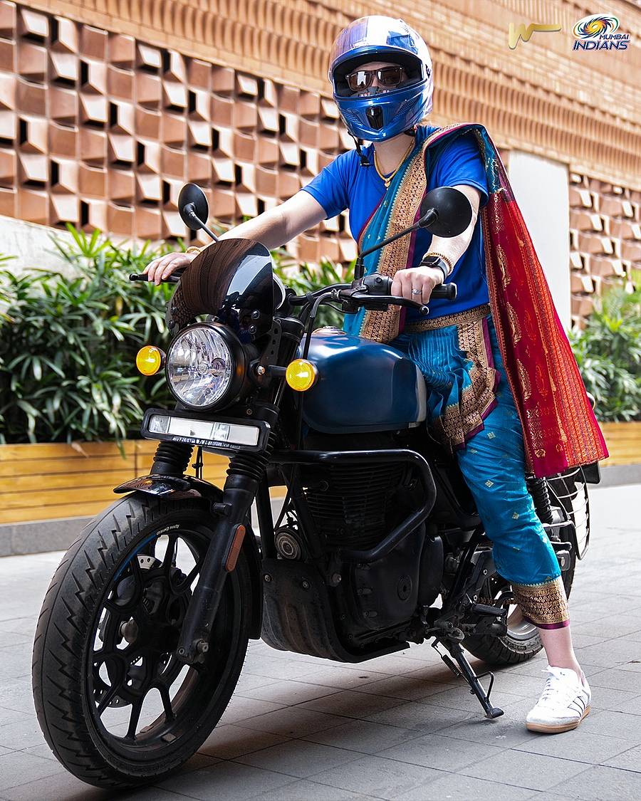 ನೀಲಿ ಬಣ್ಣದ ನೀರೆಯುಟ್ಟು, ನೀಲಿ ಬಣ್ಣದ ರಾಯಲ್ ಎನ್ಫೀಲ್ಡ್ ಬೈಕ್ನಲ್ಲಿ ಆಗಮಿಸುವ ನ್ಯಾಟ್ ಸಿವರ್-ಬ್ರಂಟ್. ನಾನು ಆಗಮಿಸಿದ್ದೇನೆ ಎಂದು ಹೇಳುತ್ತಾರೆ. ಮುಂಬೈ ಇಂಡಿಯನ್ಸ್ ತಂಡದ ಜರ್ಸಿ ಕೂಡ ನೀಲಿ ಬಣ್ಣವಾಗಿದೆ.