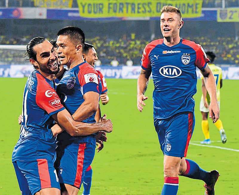 ಚೆಟ್ರಿ ಮಾಡಿದ ಮೋಡಿ: ಮೊದಲಾರ್ಧ ದಲ್ಲಿ ಚೆಟ್ರಿ ಬಳಿ ಚೆಂಡು ಸುಳಿಯದಂತೆ ಎಚ್ಚರವಹಿಸಿದ್ದ ಕೇರಳ ಆಟಗಾರರು ವಿರಾಮದ ಬಳಿಕ ಮೈಮರೆತಂತೆ ಕಂಡರು. ಅದಕ್ಕೆ ಬೆಲೆಯನ್ನೂ ತೆತ್ತರು. 55ನೇ ನಿಮಿಷದಲ್ಲಿ ಮನಮೋಹಕ ರೀತಿಯಲ್ಲಿ ಚೆಂಡನ್ನು ಗುರಿ ಸೇರಿಸಿದ ಚೆಟ್ರಿ, ಬೆಂಗಳೂರಿನ ಅಭಿಮಾನಿಗಳ ಸಂಭ್ರಮ ಮುಗಿಲು ಮುಟ್ಟುವಂತೆಮಾಡಿದರು.