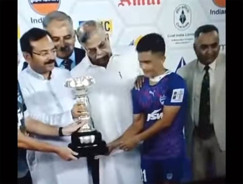 ಕೋಲ್ಕತ್ತ: ಡುರಾಂಡ್ ಕಪ್ಫುಟ್ಬಾಲ್ ಟೂರ್ನಿಯ ಪ್ರಶಸ್ತಿ ಪ್ರದಾನ ಸಮಾರಂಭದಲ್ಲಿ ವಿಜೇತ ತಂಡದ ನಾಯಕ ಸುನಿಲ್ ಚೆಟ್ರಿ ಅವರನ್ನು ಮಣಿಪುರ ಹಾಗೂ ಪಶ್ಚಿಮ ಬಂಗಾಳ ರಾಜ್ಯಪಾಲ ಲಾ ಗಣೇಶನ್ ಅವರು ಪಕ್ಕಕ್ಕೆ ತಳ್ಳಿರುವ ವಿಡಿಯೊವೊಂದು ವೈರಲ್ ಆಗಿದೆ.