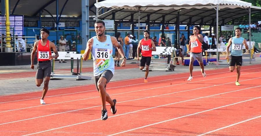 23 ವರ್ಷದೊಳಗಿನ ಪುರುಷರ 400 ಮೀಟರ್ಸ್ ಓಟದಲ್ಲಿ ಚಿನ್ನ ಗೆದ್ದ ಬೆಳಗಾವಿಯ ಶ್ರೀನಾಥ್ ಗಣಪತ್ (316) ಮತ್ತು ಬೆಳ್ಳಿ ಗಳಿಸಿದ ಭುವನ್ ಪೂಜೇರಿ (303) ಅಂತಿಮ ಗೆರೆಯತ್ತ ಮುನ್ನುಗ್ಗಿದ ರೀತಿ