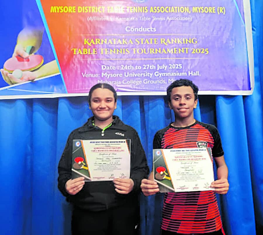 ಮೈಸೂರು: ಬೆಳಗಾವಿಯ ತನಿಷ್ಕಾ ಕಪಿಲ್ ಕಾಲಭೈರವ ಹಾಗೂ ಬೆಂಗಳೂರಿನ ಎಂ. ತಮೋಘ್ನ ಅವರು ಇಲ್ಲಿ ನಡೆಯುತ್ತಿರುವ ರಾಜ್ಯ ರ್ಯಾಂಕಿಂಗ್ ಟೇಬಲ್ ಟೆನಿಸ್ ಟೂರ್ನಿಯಲ್ಲಿ ಕ್ರಮವಾಗಿ 15 ವರ್ಷದ ಒಳಗಿನ ಬಾಲಕಿಯರು ಹಾಗೂ ಬಾಲಕರ ವಿಭಾಗದ ಚಾಂಪಿಯನ್ ಆಗಿ ಹೊರಹೊಮ್ಮಿದರು.