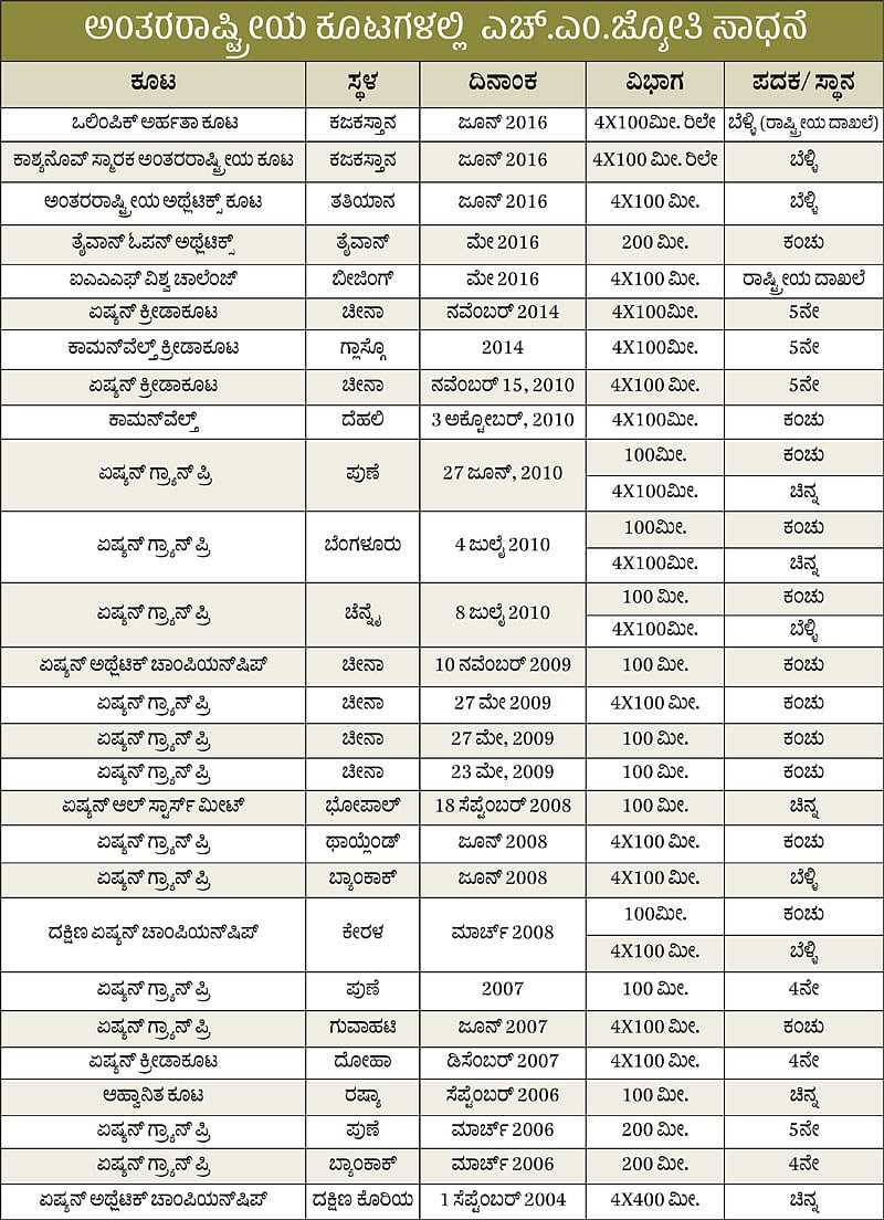 ಕಾಮನ್ವೆಲ್ತ್ ಕ್ರೀಡಾಕೂಟ, ಏಷ್ಯನ್ ಚಾಂಪಿಯನ್ಷಿಪ್, ಏಷ್ಯನ್ ಅಥ್ಲೆಟಿಕ್ ಚಾಂಪಿಯನ್ಷಿಪ್ಗಳಲ್ಲಿ ಪದಕ ಗೆದ್ದ ಹೆಗ್ಗಳಿಕೆ ಹೊಂದಿರುವ ಜ್ಯೋತಿ ಏಷ್ಯನ್ ಕ್ರೀಡಾಕೂಟದಲ್ಲಿ ಫೈನಲ್ ಪ್ರವೇಶಿಸಿ ಸೈ ಎನಿಸಿಕೊಂಡಿದ್ದಾರೆ. ರಾಷ್ಟ್ರೀಯ ಚಾಂಪಿಯನ್ಷಿಪ್ನಲ್ಲೂ ಪದಕಗಳ ಬೇಟೆಯಾಡಿರುವ ಅವರು 100 ಮತ್ತು 200 ಮೀಟರ್ಸ್ ಓಟಗಳಲ್ಲಿ ಕ್ರಮವಾಗಿ 11.30 ಹಾಗೂ 23.80 ಸೆಕೆಂಡುಗಳಲ್ಲಿ ಗುರಿ ಮುಟ್ಟಿ ಕರ್ನಾಟಕದ ಮಟ್ಟಿಗೆ ಹೊಸ ದಾಖಲೆ ನಿರ್ಮಿಸಿದ್ದಾರೆ.