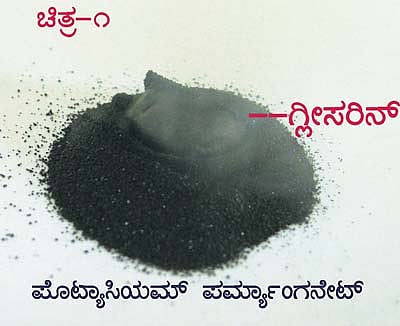 ವಿಧಾನ: 1) ಒಂದು ಚಮಚ ಪೊಟ್ಯಾಷಿಯಂ ಪರ್ಮಾಂಗನೇಟ್ನ್ನು ಒಂದು ಕಾಗದದ ಮೇಲೆ ಹಾಕಿ, ಕುಪ್ಪಿ ಮಾಡಿ, ಟೇಬಲ್ ಮೇಲಿಡಿ. 2) ಕುಪ್ಪಿಯ ಮೇಲೆ 3-4 ಹನಿ ಗ್ಲಿಸರಿನ್ ಹಾಕಿರಿ. (ನಂತರ ಒಂದೆರಡು ಹೆಜ್ಜೆ ಹಿಂದೆ ಸರಿಯಿರಿ)