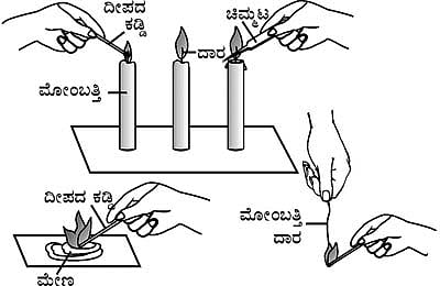 2) ಕೇವಲ ಮೋಂಬತ್ತಿಯ ಬತ್ತಿ (ದಾರ)ಯನ್ನು ಉರಿಸಿದರೆ ಅದು ಉರಿಯುತ್ತಿದೆಯೇ? ಯಾಕೆ ?