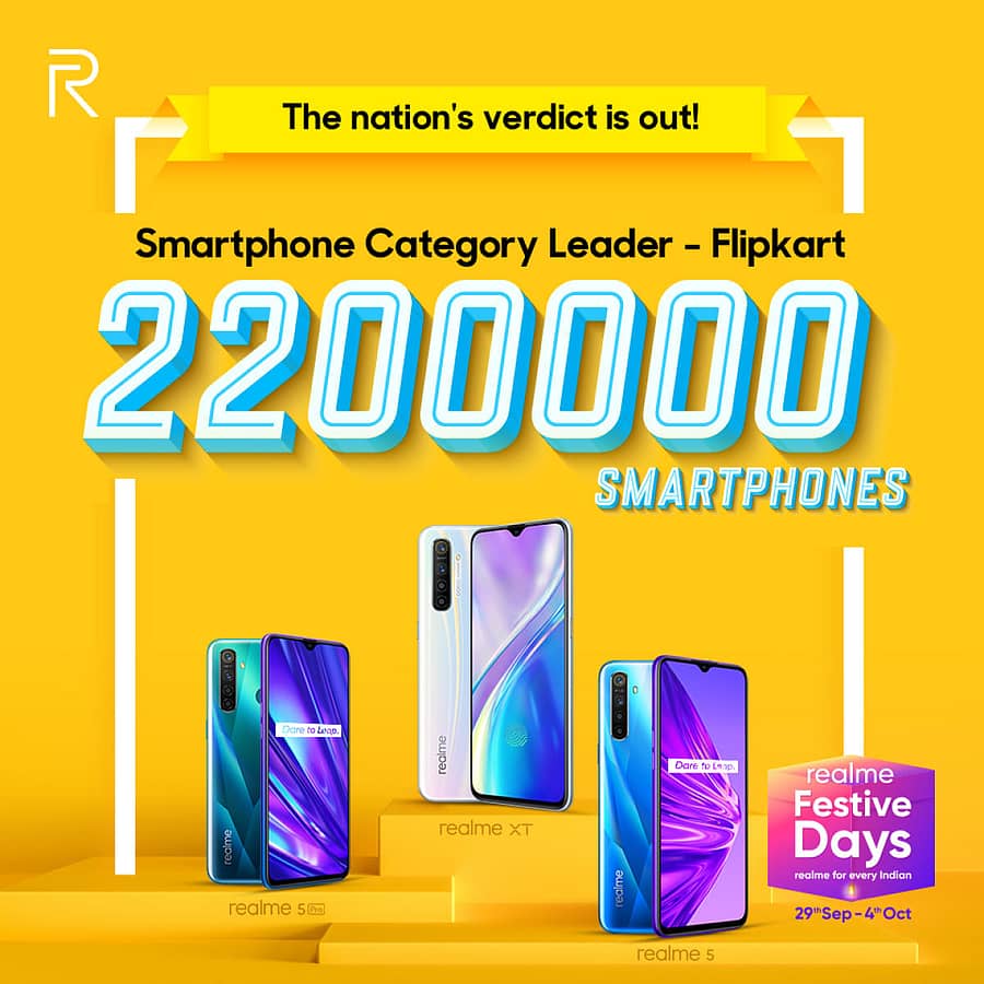 ಸೆಪ್ಟೆಂಬರ್ 30 ರಿಂದ ಅಕ್ಟೋಬರ್ 4ರವರೆಗೆ ಒಟ್ಟಾರೆ 22 ಲಕ್ಷ ಮೊಬೈಲ್ಗಳನ್ನು ಮಾರಾಟ ಮಾಡಿದೆ. ಈ ಮೂಲಕ ಅತಿ ಹೆಚ್ಚಿನ ಸ್ಮಾರ್ಟ್ಫೋನ್ ಮಾರಾಟ ಮಾಡಿರುವ ಬ್ರ್ಯಾಂಡ್ ಆಗಿದೆ ಎಂದು ರಿಯಲ್ಮಿ ತಿಳಿಸಿದೆ.