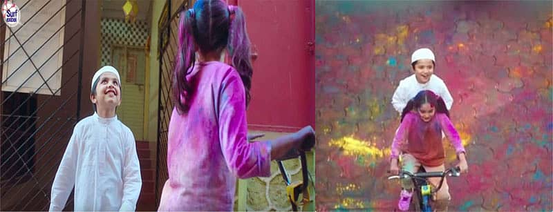 ಹೋಳಿ ಹಬ್ಬದ ಸಂಭ್ರಮದ ವಾತಾವರಣ. ಬಾಲ್ಕನಿಯಲ್ಲಿ ನಿಂತ ಮಕ್ಕಳ ಗುಂಪೊಂದು ರಸ್ತೆಯಲ್ಲಿ ಹೋಗುವವರ ಮೇಲೆ ಬಣ್ಣ ಎರಚಿ ಹೋಳಿಯಾಡುತ್ತಿರುತ್ತಾರೆ. ಆ ದಾರಿಯಾಗಿ ಬಿಳಿ ಬಟ್ಟೆ ಧರಿಸಿ ಸೈಕಲ್ ಏರಿ ಬಂದ ಬಾಲಕಿ ಬಣ್ಣ ಎರಚಿ ನೋಡೋಣ ಅಂತಾಳೆ. ಆ ಮಕ್ಕಳು ಆಕೆಯ ಮೇಲೆ ಬಣ್ಣ ಎರಚುತ್ತಿರುತ್ತಾರೆ.ಕೊನೆಗೆ ಎಲ್ಲ ಬಣ್ಣ ಮುಗಿಯುತ್ತದೆ.ಆಗ ಆ ಹುಡುಗಿ ಬಣ್ಣ ಮುಗಿಯಿತಾ? ಎಂದು ಕೇಳಿ ಸೈಕಲ್ ತಿರುಗಿಸಿ ಇನ್ನೊಂದು ಮನೆಯ ಗೇಟಿನ ಮುಂದೆ ನಿಂತು ಹೊರಗೆ ಬಾ, ಎಲ್ಲ ಬಣ್ಣ ಮುಗಿಯಿತು ಎಂದು ಕೂಗಿದಾಗ ಬಿಳಿ ಕುರ್ತಾಧರಿಸಿದ ಮುಸ್ಲಿಂ ಬಾಲಕನೊಬ್ಬ ನಗುತ್ತಾ ಹೊರಗೆ ಬರುತ್ತಾನೆ. ಆತನನ್ನು ಮಸೀದಿವರೆಗೆ ಸೈಕಲ್ನಲ್ಲಿ ಕರೆದುಕೊಂಡು ಹೋಗುತ್ತಾಳೆ ಆ ಬಾಲಕಿ. ನಮಾಜ್ ಮಾಡಿ ಬರುತ್ತೇನೆ ಎಂದು ಹೇಳಿ ಆ ಹುಡುಗ ಮಸೀದಿ ಮೆಟ್ಟಲು ಹತ್ತುತ್ತಿದ್ದರೆ, ನಮಾಜ್ ಮುಗಿಸಿದ ಮೇಲೆ ನಿನ್ನ ಮೇಲೆ ಬಣ್ಣ ಎರಚುತ್ತೇವೆ ಅಂತಾಳೆ ಆ ಹುಡುಗಿ. ಏನಾದರೂ ಒಳ್ಳೆಯದು ಮಾಡುವಾಗ ಕಲೆಯಾಗುವುದಾದರೆ ಕಲೆ ಒಳ್ಳೆಯದೇ ಎಂಬ ಟ್ಯಾಗ್ ಲೈನ್ನೊಂದಿಗೆ ಒಂದು ನಿಮಿಷ ಅವಧಿಯ ಜಾಹೀರಾತು ಮುಗಿಯುತ್ತದೆ.