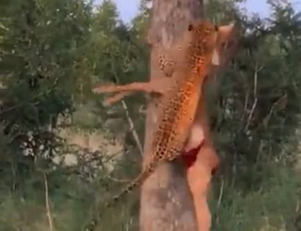 ಚಿರತೆಯೊಂದು ತಾನು ಬೇಟೆಯಾಡಿದ ಜಿಂಕೆಯ ಕಳೇಬರ ಹೊತ್ತು ಮರ ಹತ್ತಿದ ವಿಡಿಯೊ ತುಣುಕು ವೈರಲ್ ಆಗಿದೆ.