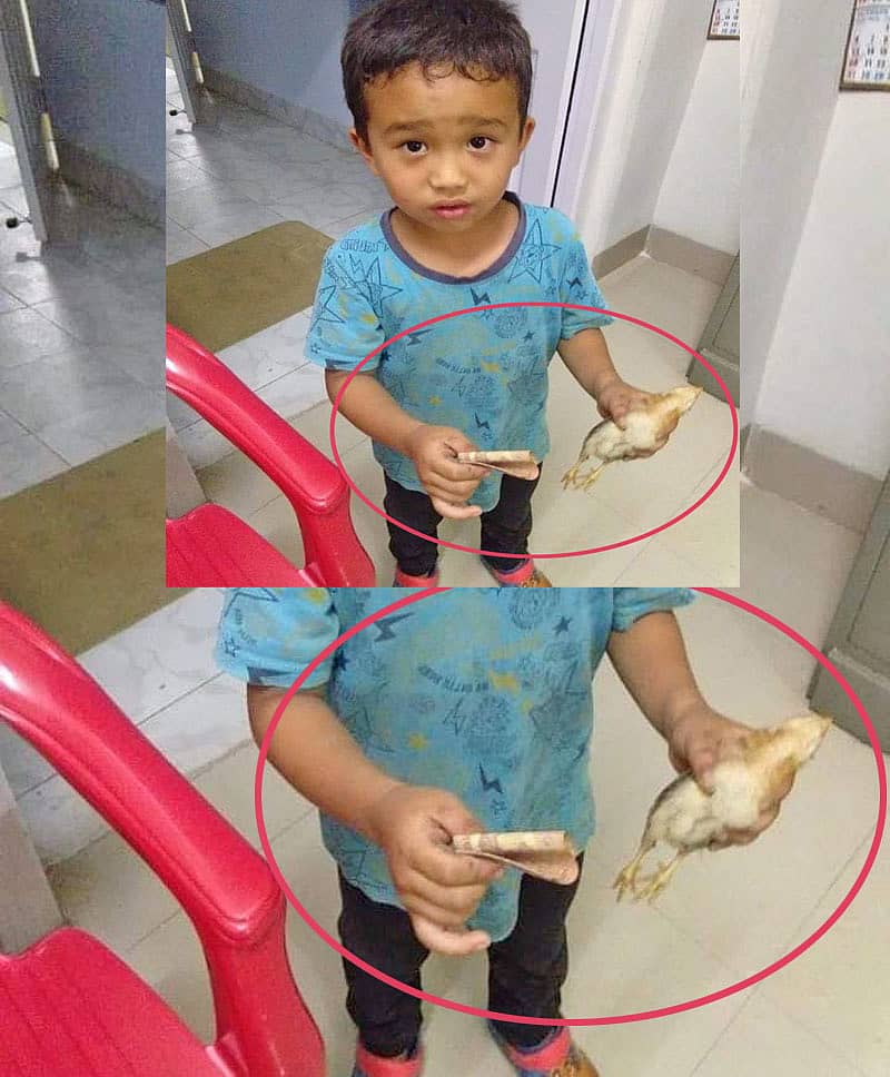 ‘ಈ ಮರಿಗೆ ಏನಾಗಿದೆ ನೋಡಿ..ಚಿಕಿತ್ಸೆ ಕೊಡಿ..’ ಎಂದು ಆಸ್ಪತ್ರೆಯಲ್ಲಿ ಪುಟಾಣಿ ಓಡಾಡುತ್ತಿದ್ದ. ಬಾಲಕ ಮುಗ್ದತೆ ಮತ್ತು ಮಾನವಿಯತೆಯನ್ನು ಕಂಡು ನರ್ಸ್ ಒಬ್ಬರು ಕಣ್ಣೀರಾದರು. ಅವರೇ ಕ್ಲಿಕ್ಕಿಸಿದ ಫೋಟೊ ಈಗ ಎಲ್ಲೆಡೆ ಹಂಚಿಕೆಯಾಗುತ್ತಿದೆ. ಕೋಳಿ ಮರಿಗೆ ಚಿಕಿತ್ಸೆ ಸಿಗದೆ ಬಿಕ್ಕಿಬಿಕ್ಕಿ ಅಳುತ್ತಲೇ ಆಸ್ಪತ್ರೆಯಿಂದ ಮನೆಗೆ ಬಂದ ಪುಟಾಣಿ, ಹೇಗಾದರೂ ಮಾಡಿ ಅದನ್ನು ಗುಣಪಡಿಸಲೇಬೇಕು ಎಂದು ತೀರ್ಮಾನಿಸಿದ್ದ. ಅಳುವುದನ್ನು ನಿಯಂತ್ರಿಸಿಕೊಂಡು ಮನೆಯಿಂದ ಮತ್ತೆ ಆಸ್ಪತ್ರೆ ಕಡೆಗೆ ನಡೆದ, ಈ ಬಾರಿ ಒಂದು ಕೈಯಲ್ಲಿ ಕೋಳಿ ಮರಿ, ಮತ್ತೊಂದು ಕೈಯಲ್ಲಿ ₹100 ಹಿಡಿದು.
