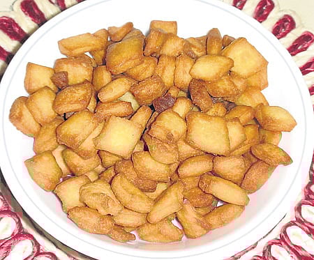 ಸಾಮಗ್ರಿ: ರವೆ ನಾಲ್ಕು ಲೋಟ, ಅಕ್ಕಿ ಹಿಟ್ಟು ಒಂದೂವರೆ ಲೋಟ, ಮೈದಾಹಿಟ್ಟು ಒಂದೂವರೆ ಲೋಟ, ರುಚಿಗೆ ಸಕ್ಕರೆ, ರುಚಿಗೆ ಉಪ್ಪು, ತುಪ್ಪ ಒಂದೂವರೆ ಲೋಟ ತುಪ್ಪ, ಕರಿಯಲು ಸ್ವಲ್ಪ ಎಣ್ಣೆ